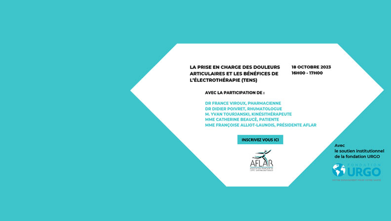 La prise en charge des douleurs articulaires et les bénéfices de l’électrothérapie (TENS) Vous pouvez également vous inscrire en cliquant sur le lien ci-dessous : https://www.bcombrun.com/URGO/18_10_2023_fondation_urgo/